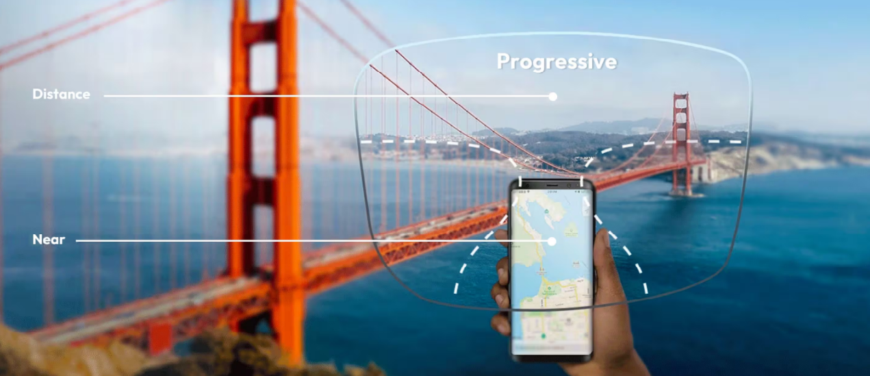Progressive lenses are a type of eyeglass lens that corrects vision at near, middle, and far distances. This is all done within a single lens, without the harsh line that bifocal and trifocal lenses have. Progressives are an excellent solution for people who have both blurry near vision and distant vision.
